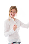 Wesoły młodych Blondynka śmiejąc się na czarnym tle