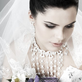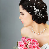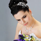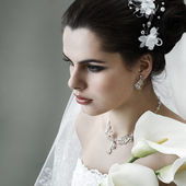 Portret pięknej panny młodej. Sukienka ślubna. Dekoracje ślubne