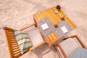 Widok z góry z młody mężczyzna pracujący na laptopie siedząc na worek fasoli czerwonej.