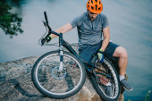 przystojny próba biker równoważenia na tylne koło na skałach na zewnątrz