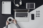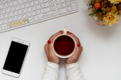 Zdjęcie "Z góry zdjęcie rąk nieczytelna kobiety za pomocą jej telefon komórkowy." może być wykorzystywane do celów osobistych i komercyjnych zgodnie z warunkami zakupionej licencji Royalty-free. Obraz jest dostępny do pobrania w jakości wysokiej rozdzielczości do 5760x3840.