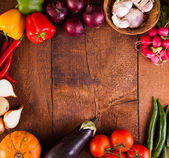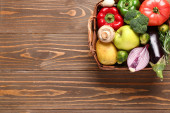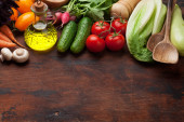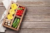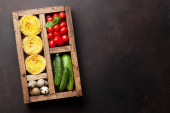 Składniki do gotowania. Makaron, warzywa i przyprawy. Widok z góry z miejscem na swój przepis