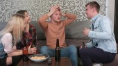 Grupa przyjaciół uśmiechający się siedzi na kanapie i opiekania butelkę piwa