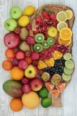 Koncepcja zdrowia żywności dla fitness z owoców, warzywa, ziarna i roślin strączkowych, bogate w antocyjany, przeciwutleniacze, witaminy i minerały w rustykalnym drewna.