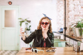Ładna pani w skórzanej kurtce siedzi przy stole z Notatnik i ołówek i sennie patrząc na bok, a spędzanie czasu w kawiarni