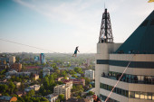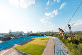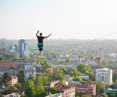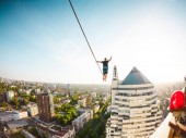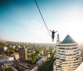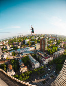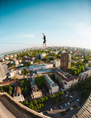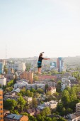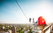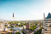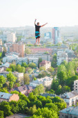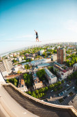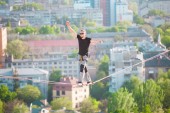 Człowiek idzie wzdłuż linii rozciągnięty pomiędzy dwoma budynkami. Człowiek łapie równowagi na wysokości. Highline nad miastem.