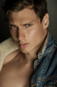 Portret facet mokrych sportu topless w plusk wody i krople