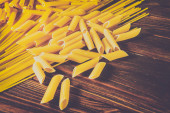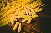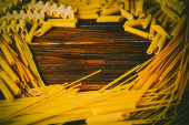 Różne rodzaje makaronu na drewnianym tle