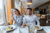 Para, słuchanie muzyki razem w kawiarni w słoneczny dzień w kawiarni