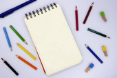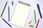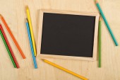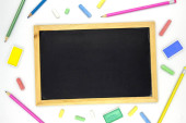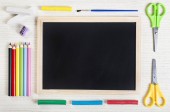 Pusta tablica ze sztuką dostarcza na białym tle. Tablica i kreda kolorowy płaski układ zdjęć. Szkoła dostaw szablon transparent z tekstu miejsce. Początku roku szkolnego. Chalk zarządu makieta widok z góry