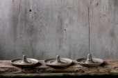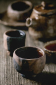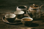 ceramiczne miski i dzbany z metalu kształty i czosnek na brązowy drewniany stół