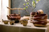 Zdjęcie "ceramiczne miski i dzbany z metalu kształty i czosnek na brązowy drewniany stół" może być wykorzystywane do celów osobistych i komercyjnych zgodnie z warunkami zakupionej licencji Royalty-free. Obraz jest dostępny do pobrania w jakości wysokiej rozdzielczości do 5760x3840.