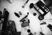 Narzędzia z fryzjerem na pulpicie przed lustrem. Czarno-białe zdjęcie fryzjera narzędzi. Zdjęcie w ciemnym klucz.