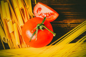 Zdjęcie "Makaron z pomidorami na podłoże drewniane" może być wykorzystywane do celów osobistych i komercyjnych zgodnie z warunkami zakupionej licencji Royalty-free. Obraz jest dostępny do pobrania w jakości wysokiej rozdzielczości do 5760x3840.