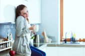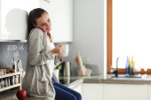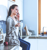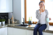 kobieta przy użyciu telefonu komórkowego siedzi w nowoczesnej kuchni.