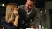 Mężczyzna dyrektor daje pieniądze na jego asystentka w kawiarni, a ona liczenia to