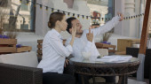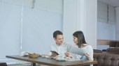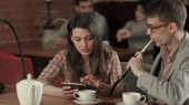 Młoda kobieta rozmawia przez telefon podczas lunchu i jej partnera z prośbą o pomoc