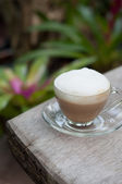 Kawa cappuccino na drewnianym balkonem z bliska