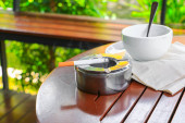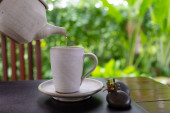 filiżanka kawy na podłoże drewniane podłogi