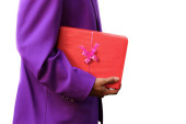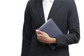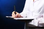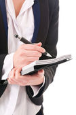 Biznesmen z notatnika w rękach podpisywania dokumentów na białym tle