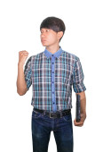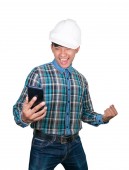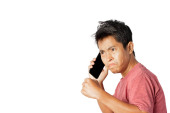 Młody przystojny biznesmen mylić, rozmowy na telefon komórkowy na białym tle