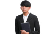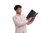 Biznesmen przystojny, w ręku podpisywania zapis dokumentu w Notatniku na białym tle