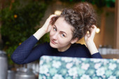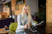 Zdjęcie "Styl i ludzi. Przemyślane poważne blond kobieta wygląda go na odległość, zastanawia się o coś, siedzi przed wnętrze przytulnej kawiarni. Atrakcyjna młoda kobieta piękny napoje Kawa jest w myśli" może być wykorzystywane do celów osobistych i komercyjnych zgodnie z warunkami zakupionej licencji Royalty-free. Obraz jest dostępny do pobrania w jakości wysokiej rozdzielczości do 5760x3840.