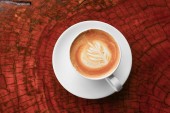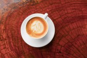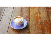 Kawa cappuccino w podłogę z drewna z bliska na białym tle
