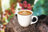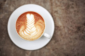 Kawa cappuccino z bliska na tle drewna
