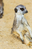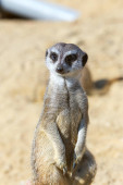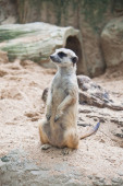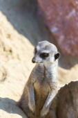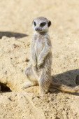 Meerkat (Suricata suricatta) na piaszczystej ziemi do stróżowania i bezpieczeństwa