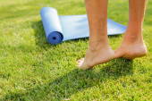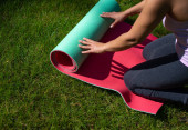 Ładna Azjatka trzyma mat Joga Zielona i przygotować się do ćwiczeń jogi w parku. Używane dla relaksu i zdrowego koncepcji