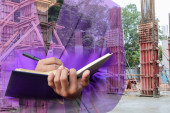 Zdjęcie "podwójnej ekspozycji, biznesmen z notatnika w ręku podpisywanie dokumentów w konstrukcji witryny pracy koncepcja." może być wykorzystywane do celów osobistych i komercyjnych zgodnie z warunkami zakupionej licencji Royalty-free. Obraz jest dostępny do pobrania w jakości wysokiej rozdzielczości do 5760x3840.