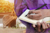 podwójnej ekspozycji, biznesmen z notatnika w ręku podpisywanie dokumentów w konstrukcji witryny pracy koncepcja.