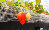 Widok truskawki wiszące gospodarstwo pełne dojrzałych truskawek, Chiba, Japonia