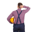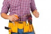 Atrakcyjne młody mechanik z żółtym pasem kask i narzędzia na na białym tle
