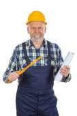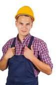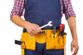 Uśmiechnięty młody technik nosić kask ochronny i narzędzie żółty pas na na białym tle