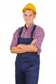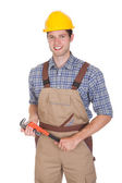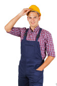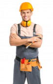 Uśmiechnięty młody technik nosić kask ochronny i narzędzie żółty pas na na białym tle