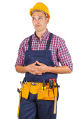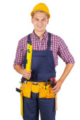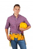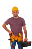 Atrakcyjne młody mechanik z żółtym pasem kask i narzędzia na na białym tle