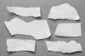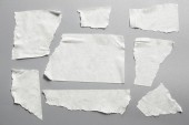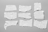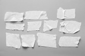 Zestaw z białej taśmy na szarym tle. Poszarpane poziome i różnych wielkości biały taśmą klejącą, kawałki kleju.