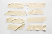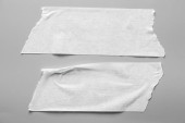 Zestaw z białej taśmy na szarym tle. Poszarpane poziome i różnych wielkości biały taśmą klejącą, kawałki kleju.
