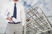 biznesmen z notatnika w ręku podpisywanie dokumentów w konstrukcji strony pracy, koncepcja podwójnej ekspozycji.