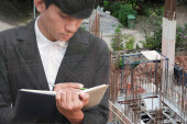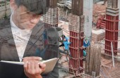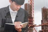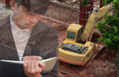 biznesmen z notatnika w ręku podpisywanie dokumentów w konstrukcji strony pracy, koncepcja podwójnej ekspozycji.
