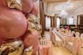 Studio fotograficzne, ozdobione balony helowe, biały, srebrny i fioletowy. Piękne, twórczy i oryginalny