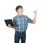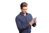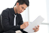 Student, czytając książkę na egzamin na białym tle