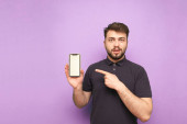 Zabawny kupujący stoi w sklepie tech światła i wybiera tabletki. Portret kupującego w sklepie przez wybór gadżet.