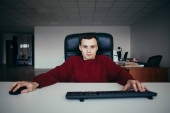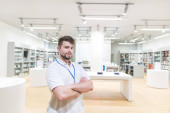 Portret doradcy tech człowiek. Konsultant pozuje do kamery na tle światła elektronika sklep.