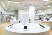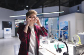 przystojny mężczyzna stoi w sklepie tech światła i słucha muzyki w słuchawkach. Kupujący wybiera gadżety w sklepie elektronicznym. Wybieranie i kupowanie słuchawki w sklepie