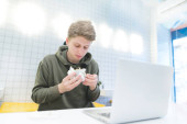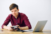 Zdjęcie "Śmieszne młody człowiek patrzy na quadcopter w sklepie lekkie tech. Drony zakupu w sklepie elektronicznym." może być wykorzystywane do celów osobistych i komercyjnych zgodnie z warunkami zakupionej licencji Royalty-free. Obraz jest dostępny do pobrania w jakości wysokiej rozdzielczości do 5760x3840.