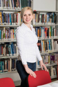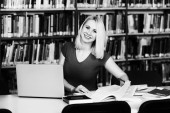 W bibliotece - bardzo kobiece Student z książek pracy w liceum - Biblioteka Uniwersytecka - płytkiej głębi ostrości
