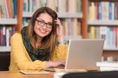 Portret atrakcyjny uczeń, jakiejś pracy szkoły z laptopem w bibliotece